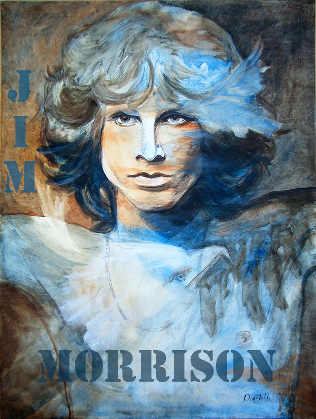 Janis Joplin was a huge talent in a tiny woman, best loved for her powerful singing voice. She was conflicted daily between her ego and her self esteem. |  This painting of Jim Morrison seems to take flight with emerging bird wings and an eagle that appeared on his chest while I was blocking in his figure. |  My vision of Marilyn reveals the vulnerability and emotional frailty that belies her public sex symbol persona. With her hands placed behind her back and plunging neckline, she seems to be offering herself up to the highest bidder. |